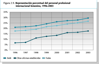271. Equilibrio de género en la plantilla profesional. El aumento de la proporción de personal femenino de categoría profesional es uno de los principales objetivos de la política de recursos humanos de la Organización. Los esfuerzos realizados durante los cuatro últimos bienios han dado lugar a un aumento del número de mujeres en puestos profesionales en la Sede, cuya proporción pasó del 21 por ciento al comienzo de 1996 al 30 por ciento al final de 2003, mientras que el aumento en todos los destinos fue del 18 al 27 por ciento (Figura 2.9). Estos porcentajes se basan en el número total de funcionarios profesionales con contratos a plazo fijo o continuos en la Sede y otras oficinas establecidas