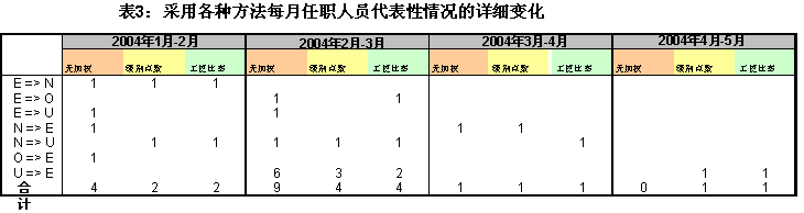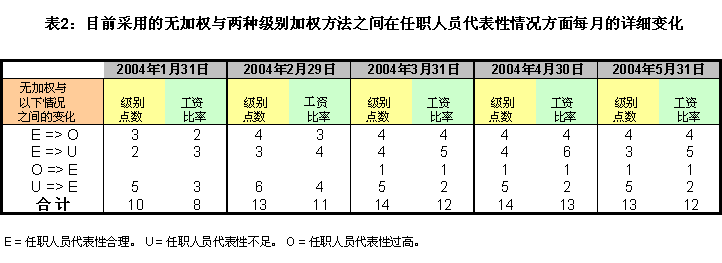 10. 应注意到,每月职工人数都有变化(如上任、离任和调动),对任职人员代表性情况的潜在影响较低。下表3说明了三种方法影响的差别。