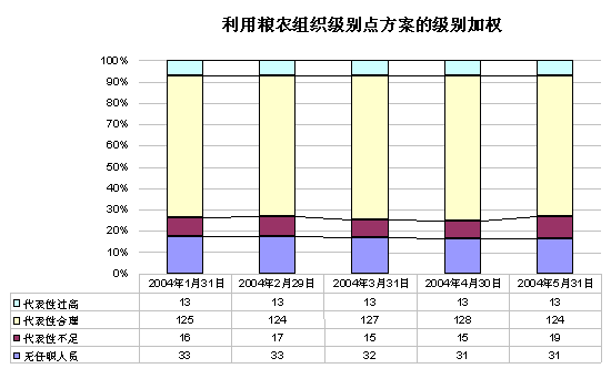 7. 分析涵盖2004年1月至5月期间。它比较了所批准的(无级别加权)方法的结果与其他两个采用不同级别加权方案的结果:(1)根据以前的方法在粮农组织正式采用级别点加权方式和(2)以级别工资比率为基础的方式(附件I指出了两种方式的各自价值,并有对其来源的解释)。附件II以图表形式说明了这三种方法在该时期总的影响。附件III说明了对各国的影响。下表1概述了结果: