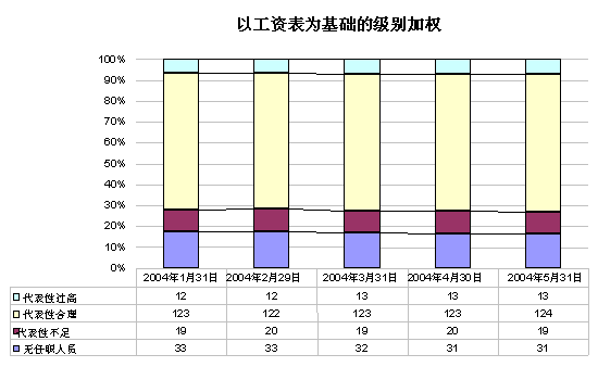 4. 采用加权方式的其他组织将专业人员和更高职类人员的工资表作为加权的基础。按照这种方法,每一级别的工资除以P-1工资水平而确定作为该级别“价值”的比率。以上第四栏中说明了这种加权方式3。