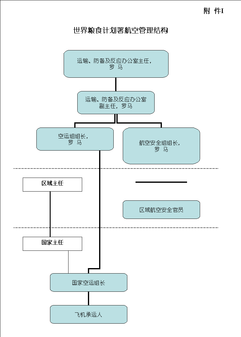 11. 根据2003年执行干事批准的一项组织机构,空运活动由具体国家办事处负责规划、出资并执行,由世界粮食计划署罗马总部和运输、反应及防备办公室提供咨询和专家支持。在这个结构下,各个行动的行政报告工作由具体国家的主任负责;其执行报告通过包括空运及安全单位在内的航空组递交给运输、反应及防备办公室。参见附件1。