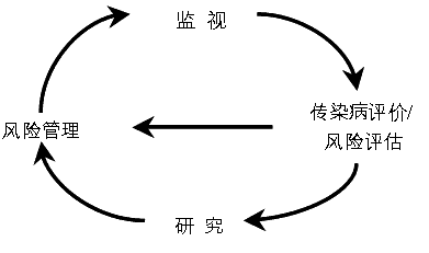 图3公众健康保护周期,表明监视在支持风险评估、风险管理和拟定新研究工作方面的作用。