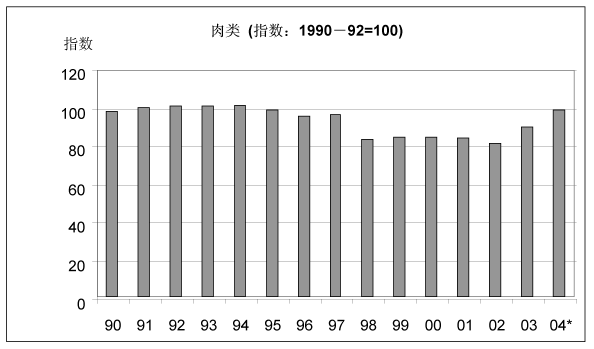 28. 由于在主要的肉类出口国家出现动物疾病的爆发,导致了禁止从这些地区的进口从而减少了其出口供应量,这使得2003年和2004年上半年国际肉类价格上升。2004年家禽和猪肉价格基本适中,但由于疾病问题及较高的饲料价格影响了生产和贸易前景,牛肉价格持续高涨。