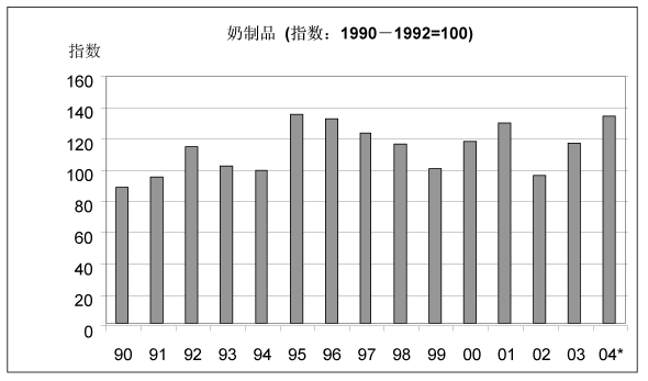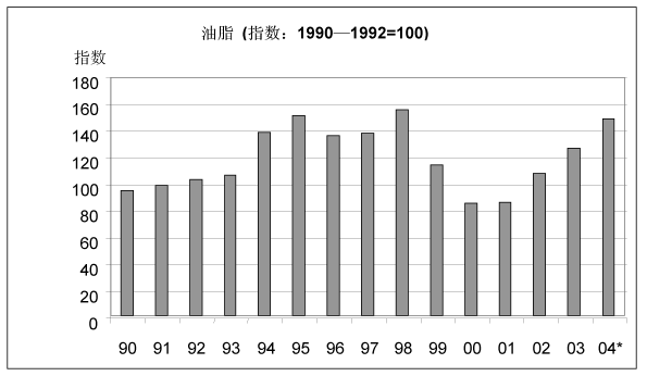 25. 2003年和2004年上半年,基本粮食产品的价格达到了自上世纪90年代中期以来的最高水平(附件图11)。油脂的价格从2000年和2001年下滑的水平上升了60%,从而引发了上述的趋势。其它基本食品的价格均有上升,包括谷物、肉类和奶类,虽然其幅度较小。