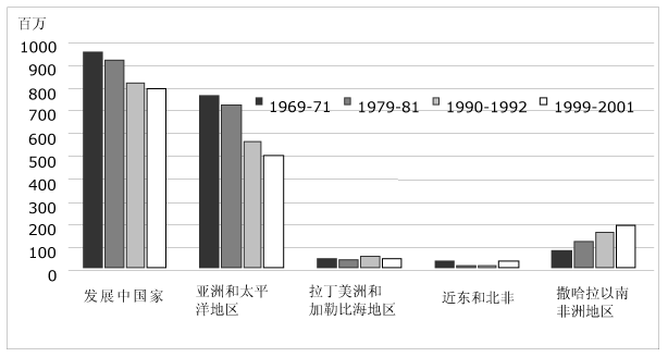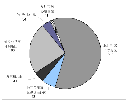 3. 粮农组织估计1999-2001年全世界食物不足人口为8.42亿:其中7.98亿在发展中国家,3400万在转型国家,1100万在发达的市场经济国家(见附件图1)。全部食物不足人口的一半以上(60%)在亚洲和太平洋地区,其次是撒哈拉以南非洲地区,占总数的24%。