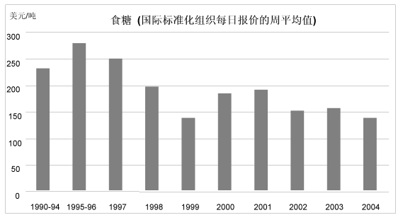 29. 与基本粮食产品的价格上扬情况相比,热带作物产品和原料价格的情况各异。2004年食糖价格连续第五年低迷。虽然存在相对很强的需求以及全球库存量下降,但是一些重要出口国的大丰收和某些纯进口国生产量的扩大对世界价格形成了下跌压力。