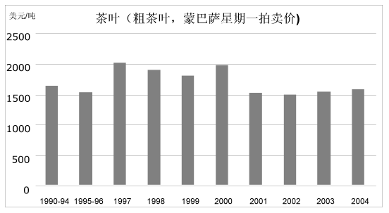 30. 咖啡价格从2001年的极低水平略有恢复。虽然出现了一些周期性恢复的迹象,但是咖啡价格保持在远远低于二十世纪九十年代初期平均值的水平,表明了其供给高于相对的需求。继1980年至2000年间可可豆价格下跌了近50%之后,可可豆价格在2002年和2003年强劲复苏,主要是由于疾病减少了收成。2004年可可豆价格略有下降,但基本保持在二十世纪九十年代的平均水平。
