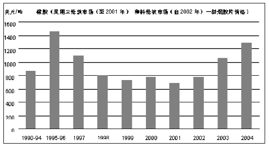 31. 由于收成较少且需求较强从而减少了库存水平,这对市场施加了价格上涨压力,棉花价格继2001年和2002年急剧下降之后出现上扬。因为农民减少了种植面积,2002/03年度全球棉花产量下降了10%。石化类纺织品的价格上升刺激了对棉花的需求。2003年和2004年橡胶价格也从前些年的极低水平上得到了复苏。更强劲的经济增长和石油合成橡胶的更高价格也导致了橡胶价格的恢复。