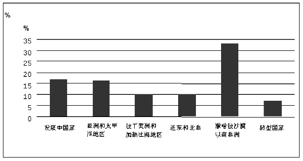 4. 在不同的发展中国家区域之间,食物不足人口的比例各不相同(附件图2)。撒哈拉以南非洲地区食物不足发生率最高,粮农组织估计其33%的人口存在食物不足。这大大超过了亚洲和太平洋地区的估计值17%,拉丁美洲和加勒比海地区以及近东和北非的估计值为10%。