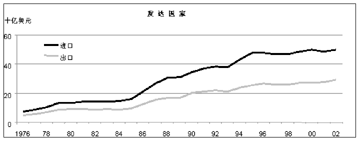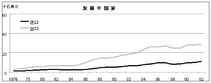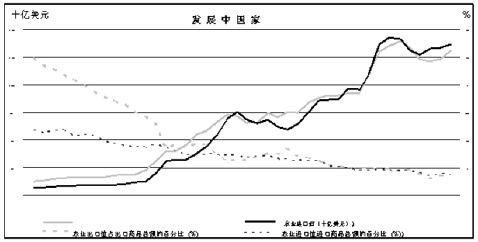 34. 直到二十世纪九十年代初期,发展中国家才在大多数年份出现农产品贸易顺差。发展中国家这种传统的农产品贸易顺差形势不断受到威胁,在二十世纪九十年代的大部分时间里,其农业出口和进口大致维持平衡,而在1999年变为贸易逆差(附件图14)。粮农组织的2030年展望3表明,发展中国家作为一个整体,这些国家将变成纯农业进口国,预计发展中国家的农业贸易逆差至2015年达到180亿美元(按1997/99年度美元价值计算),在2030年达到350亿美元。