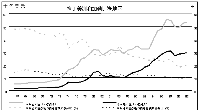37. 不同的发展中国家地区农业贸易的情况差异极大。特别是在二十世纪九十年代中期前后,拉丁美洲和加勒比海地区扩大了农业贸易顺差。在这期间,亚洲和太平洋地区变成了农业纯进口国,而近东和北非巨大的结构性逆差尚无减少的迹象。