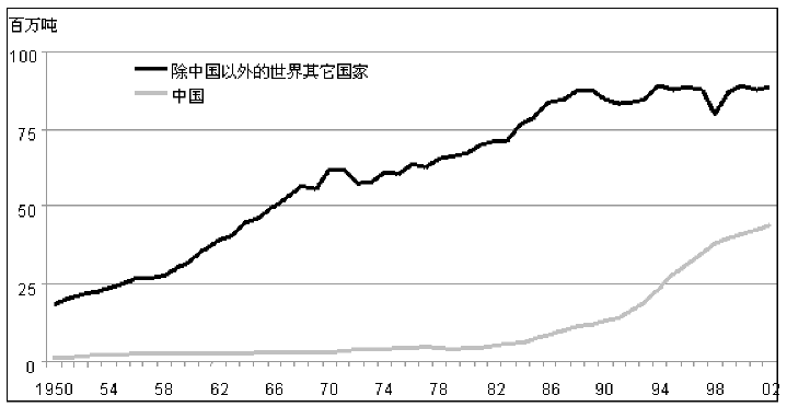 44. 近年来世界水产养殖业生产增长迅速,目前已占渔业生产总量的约30%(附件图17)。这种增长的大部分归因于中国,目前其占世界水产养殖业生产总量的三分之二以上(2002年为2780万吨)。