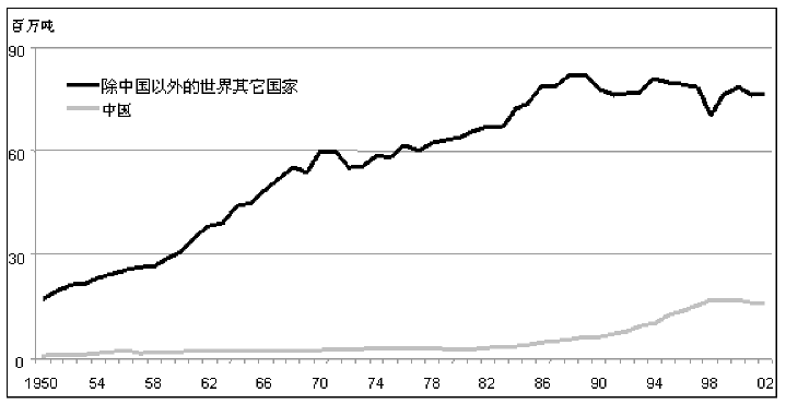 43. 2002年渔业总产量1.33亿吨,其中3980万吨来自于水产养殖业(附件图15)。世界捕捞渔业生产为9320万吨,略高于2001年产量(+0.4百分点)(附件图16)。近年来捕捞渔业产量的大部分波动是由于秘鲁鯷捕捞量的变化,其受到气候条件(即厄尔尼诺)的影响。2002年中国报告的产量为1660万吨,与2001年持平。其它的主要生产国为秘鲁(880万吨)、美国(490万吨)、印度尼西亚(450万吨)以及日本(440万吨)。