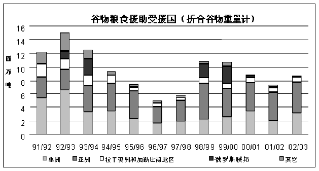 16. 在2002/03年度(七月至六月)谷物类粮食援助达到860万吨,比2001/02年度(附件图5)增加了120万吨(或17%)。这些增长是用于非洲和亚洲,流向拉丁美洲和加勒比海地区的装运量略有下降,而流向俄罗斯联邦的装运量几乎下降为零。就装运量而言,2002/03年位列谷物类粮食援助受援国前五位的国家是伊拉克、埃塞俄比亚、朝鲜民主主义人民共和国、阿富汗和孟加拉国。除了伊拉克以外,上述国家以往均位居粮食援助受援国的前五位。