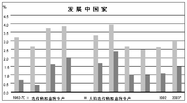 19. 最近两年全球作物和畜牧产量增长率均有提高,尽管2003年的临时估计值低于过去四个十年的平均值。但是就人均而言,产量增长率略高于近十年的平均值(附件图6)。将发展中国家归为一组,绝对和人均意义上的产量增长率均相当稳定,虽然二十一世纪的头几年略低于二十世纪八十和九十年代的水平。发达国家组的产量增长率相当不稳定性。