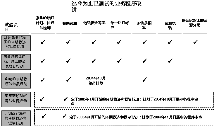 24. 图3展示了试验项目迄今为止在业务程序上改进的概况。业务程序审查小组正致力于强化需求评估和强化预算批准程序,并且将尽快地开始增加粮食援助的优先性和捐助者报告。
