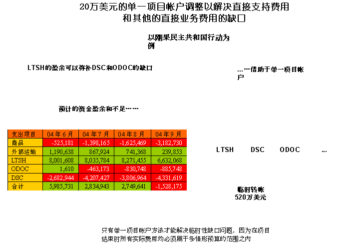 37. 刚果民主共和国国家小组于五月份开始使用其新的财务和供应链计划工具,以便确定所发生的直接支持费用(DSC)和其他的直接业务费用(ODOC)的临时缺口,因为这两项费用往往要在项目的早期就要支付一些款项,例如较长雇用期的职员工资。与此同时,刚果民主共和国在陆地运输、储藏和处理上出现余款,因为该费用平均是在商品购买之后平均3-4个月时才需要支付。该项目在陆地运输、储藏和处理(LTSH)款项上有520万美元不属于急需,通过单一项目帐户的方法,该笔资金被用于弥补直接支持费用和其他的直接业务费用的临时缺口(见图4)。