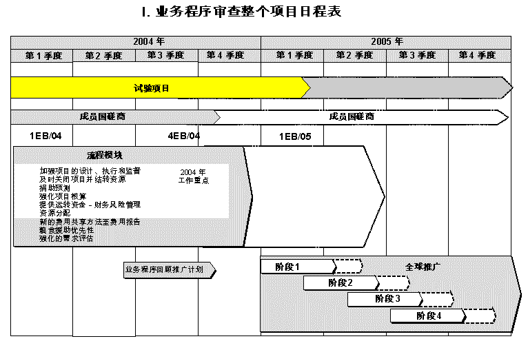 秘书处于2003年3月开始了业务程序审查,其旨在提高世界粮食计划署的工作效率。该审议具有两个目的:(i) 最大限度地利用项目指定资源,(ii) 提高粮食援助按时可利用性。审议过程中所提出的建议采取了一系列试验项目的形式,现正在实地进行试验。第一个试验项目是于2003年12月启动。