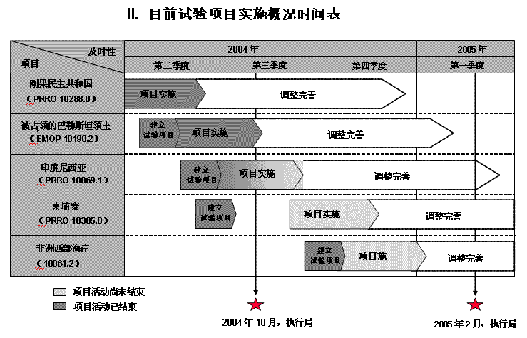 4. 选择了五个试验项目:刚果民主共和国的长期救济和恢复行动,被占领的巴勒斯坦领土的紧急援助行动和柬埔寨、印度尼西亚及非洲西部海岸地区的长期救济和恢复行动。