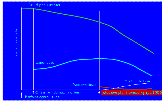 作物育种战略高度依赖于作物及其野生亲缘植物多样性的保存程度。传统和现代生物技术的多种方法都能够对关系到进一步育种工作的生物多样性进行干预。具体到作物,这些方法往往只集中在对一些优良品系继续进行改良;而大部分适应当地条件的原有地方品种却无法继续得以繁殖。另外,知识产权保护体系也干预到作物的多样性。科学界和公众都越来越担忧多样性的迅速下降,包括当地品种的多样性。但另一方面,生物技术的现代化手段也能为多样性带来好处,特别是在由于不育性和有害生物使得传统繁育方法难以为继的情况下,例如关于香蕉的论述。 34