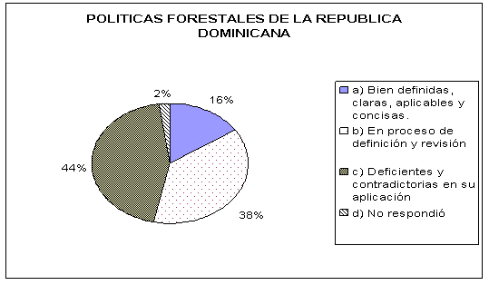 El 44% (la mayoría) piensan que la política forestal es deficiente y contradictoria en su aplicación y que debe ser fortalecida, con incentivos a los productores.. “Hay que expeditar los trámites legales de asuntos forestales. Hay que establecer mecanismos para incentivar la actividad forestal. Los empresarios necesitan sentirse seguros de su inversión porque la ley actual tiene incertidumbres. El país no ha tenido una política forestal sostenible.. Existe una política forestal pero se debe fortalecer en su aplicación práctica”, opinó la mayoría.