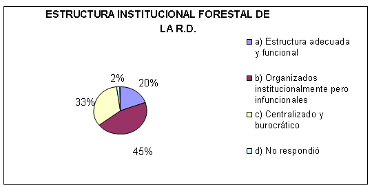 La percepción de los encuestados sobre la estructura institucional del país se muestra en el gráfico 9. Un 20% define la institución como adecuada y funcional, un 40 % considera que el sector forestal está bien organizado institucionalmente en cuanto a documentos, leyes, reglamentos y políticas pero que no responden a las necesidades del país; el 30 % opina que es centralizado y burocrático; el 2 % no respondió.