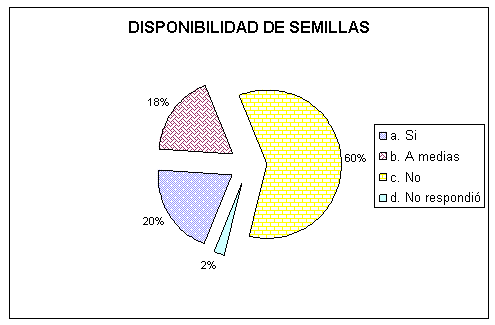 El 60% considera que no hay disponibilidad de semillas por las siguientes razones: Las semillas no están a tiempo para la época de producción, existe una baja producción local con mala calidad, hay que conseguir mejor tecnología para obtener semillas en cantidad y de mejor calidad, hacen falta huertos semilleros que permitan asegurar una producción confiable, no existen bancos de semillas calificados, ni fuentes semilleras, ni técnicas de recolección, ni rodales productores de semillas de buena calidad por lo que la SUREF tiene que comprar semillas en Cuba ya que no hay rodales para germinación de simientes, aunque también se recolectan gran parte de las semillas que utiliza.