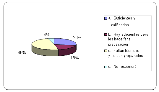 El 29% de los encuestados opina que hay suficientes técnicos y que están calificados, el 18 porciento considera que hay suficientes técnicos pero que se deben reforzar sus conocimientos técnicos con el entrenamiento en servicio, el 49 porciento cree que faltan técnicos y que éstos están mal distribuidos territorialmente (zonas de concentraciones y zonas de escasez), y que los pocos que abundan no se les da el uso adecuado; el 4 % de los convocados no respondió este aspecto. El gráfico 13, que aparece más abajo, muestra todo lo anterior.