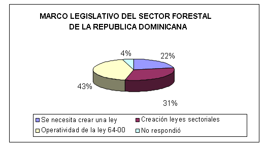 El gráfico14 muestra uno de los aspectos más cambiantes y que a la vez genera más incertidumbre en el sector forestal es el referente a la legislación, lo que expresó el 43% de los encuestados sobre la funcionalidad, aplicabilidad y operatividad de la ley No. 64 – 00 de medio ambiente y recursos naturales. Antes la política forestal estaba en manos de militares y aunque ahora esté en manos de técnicos y profesionales civiles, continúan los mismos impedimentos y trabas. Los inversionistas privados pensaban que el proceso de manejo iba a ser más fluido, pero no ha sido así. Pues aún hay mucha burocracia y lentitud para el manejo de los bosques. En este orden algunos entienden que no se respetan las políticas forestales.