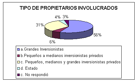 Como se muestra en el gráfico 15, un 56% opina que los grandes propietarios de tierras (ganaderos, cañeros y latifundistas) deben ser los principales inversionistas en la actividad forestal (actualmente 475,000 has equivalentes al 10% del país son fincas ganaderas). Estos piensan que en los próximos 20 años no se habrá cambiado la relación de proporcionalidad en la tenencia de la tierra.
