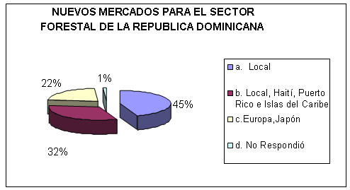 El gráfico 17 muestra que un 45% de los entrevistados entiende que el mercado debe continuar localmente, pues el país no está preparado para enfrentar la calidad y los precios de un mercado globalizado; y al productor dominicano le hace falta tecnología para lograr la estandarización y calidad de la madera.