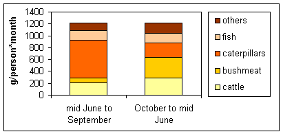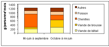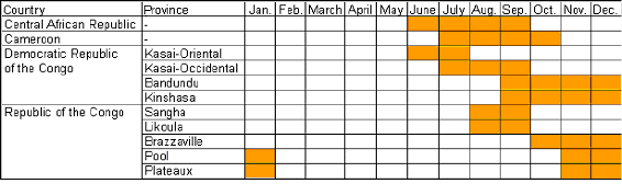 La récolte des chenilles est une activité saisonnière alors que la récolte des larves s’étend sur toute l’année. La période de collecte a souvent lieu durant la saison des pluies (Malaisse, 1997). La disponibilité des chenilles peut extrêmement varier entre les différentes régions d’un pays en raison des conditions climatiques différentes (Tableau 3). Les pluies entravent les activités de récolte et encore plus la conservation des chenilles; le poisson et le gibier sont eux-mêmes souvent plus difficiles à attraper à la saison des pluies.