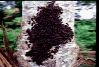 Colonie d’Imbrasia ertli dans le tronc de Funtumia sp. (Latham)