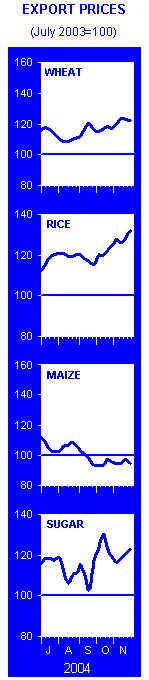 International wheat and coarse grains prices are generally lower than a year ago, but those for rice remain well above levels in 2003.