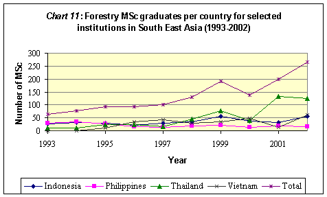 • In Laos, the first batch of 31 BSc Forestry students graduated as recently as 2000, increasing to 137 in 2002.