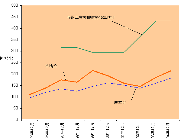 4. 表1表明了从1993年以来与职工有关的债务精算估价相比长期投资组合市场价和成本价的变化情况(从1997年起)。
