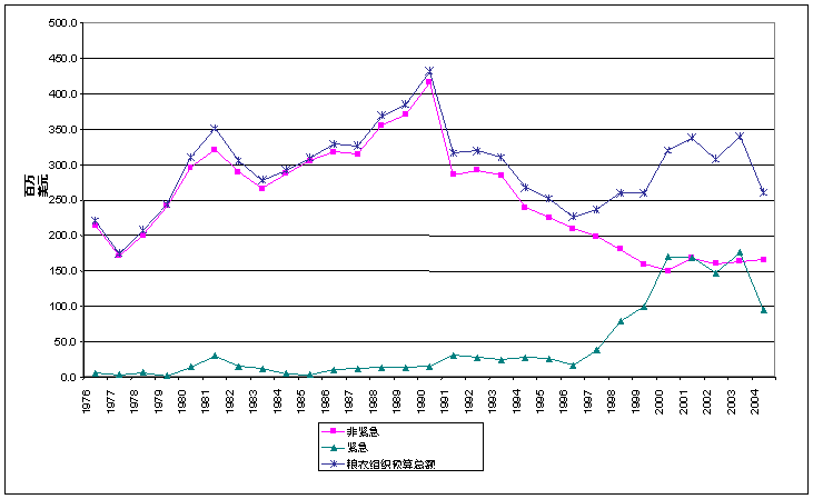 7 图1a和图2顶上一行的2000-2004年数额是不同的。图1a 包括了全部计划外资金,无论是在实地还是在总部和区域办事处使用的资金。图2则排除了2000-2004年间的规范性项目,以便更忠实地反映实地的实际情况。由于技术上的原因,不可能在2000以前的年份中排除规范性项目和其他预算外资金。