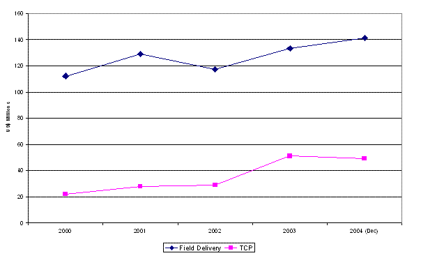 Chart 2: Total Field Delivery and TCP Delivery (2000-2004, excluding emergencies)7