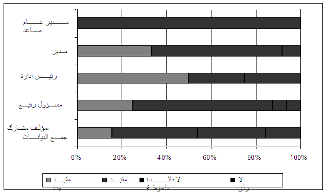13 - ويوجز الرسم البياني 1 الردود التي وردت في الاستبيان بشأن فائدة التقييم الذاتي. ويبين أن جميع المديرين العامين المساعدين الذين أجابوا على الاستبيان اعتبروا التقييم الذاتي مفيداً. وعلى مستوى المدراء، اعتبره 33 في المائة من المجيبين مفيداً جداً و58 في المائة مفيداً و8 في المائة فقط لم يروا فيه أي فائدة مميزة. واعتبر المديرين أن عملية التقييم الذاتي مفيدة أو مفيدة جداً، لتحسين تخطيط الكيانات البرامجية وتحديد المجالات التي تحتاج إلى تحسين.