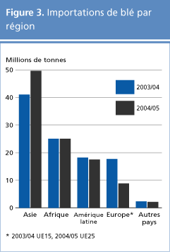 Selon les prévisions actuelles, le commerce mondial du blé2/ pendant la campagne de commercialisation en cours 2004/05 (juillet/juin) atteindrait 103 millions de tonnes, ce qui représente 2,5 millions de tonnes de plus que prévu antérieurement et est beaucoup plus proche du niveau de la campagne précédente. La révision à la hausse de ce mois-ci s'explique essentiellement par le relèvement des prévisions concernant les importations de l’Afghanistan, de l'UE et de la Fédération de Russie. S’agissant du groupe des pays en développement, les importations totales de blé s’établissent à 82 millions de tonnes, soit 7 millions de tonnes de plus que pour la campagne précédente. En Asie, les importations de blé s’établissent à près de 50 millions de tonnes, soit pratiquement 9 millions de tonnes de plus (21 pour cent) que pour la campagne précédente et légèrement en dessous du record atteint en 1999/2000. Les importations de blé de la Chine (continentale), qui devraient doubler au cours de cette campagne, représentent près de la moitié de la hausse des importations prévue dans tous les pays d'Asie. Bien que la production de blé de la Chine ait progressé de 6 pour cent en 2004, la forte demande de blé de qualité ainsi que le niveau relativement bas des cours mondiaux continuent de favoriser d’importants achats de blé étranger. Selon les prévisions, les importations de blé de l’Afghanistan avoisineraient 1,6 million de tonnes, soit une augmentation de 1,3 million de tonnes par rapport à 2003/04. Cet accroissement des importations est dû au fort recul de la production intérieure de blé après la récolte record de 2003. Le Pakistan figure parmi les autres pays d'Asie où les importations devraient être en nette hausse pendant cette campagne; elles augmenteraient de 1,3 million de tonnes pour s’établir à 1,5 million de tonnes, chiffre le plus élevé enregistré depuis 1999/2000. Cela est dû essentiellement au faible niveau des stocks de report de la campagne précédente et à la production inférieure aux objectifs en 2004. En revanche, les importations de blé de la République islamique d'Iran, qui figure traditionnellement parmi les principaux importateurs mondiaux, devraient rester négligeables en raison d'une nouvelle récolte exceptionnelle en 2004 (voir le dossier spécial page). Contrairement à ce qui se passe en Asie, les importations de blé de l’Europe devraient reculer considérablement au cours de cette campagne, suite à la forte reprise de la production dans plusieurs pays et à l'élargissement de l’UE, qui est passée de 15 à 25 pays3/. Selon les prévisions actuelles, les importations totales des 25 pays de l’UE atteindraient 5,5 millions de tonnes, soit une augmentation d’un million de tonnes depuis le précédent rapport qui s'explique par des engagements plus élevés concernant les importations, de l’ordre de 5 millions de tonnes au début mars. En Afrique, les importations totales de blé s’établissent à 25 millions de tonnes, chiffre inchangé par rapport à 2003/04. Suite aux récoltes généralement bonnes dans la quasi-totalité des grands pays producteurs de blé, les importations de la plupart des pays d'Afrique devraient rester en dessous du niveau de l'année précédente. Le Kenya fait exception, l’augmentation de ses importations de blé étant mise en évidence par les achats importants (400 000 tonnes) effectués auprès de l’Argentine jusque-là. En Amérique centrale et aux Caraïbes, le léger accroissement des importations du Mexique devrait neutraliser la réduction des achats au Brésil. Au Mexique, la baisse de la production en 2004 est généralement responsable de l'accroissement des importations pendant cette campagne. Au Brésil, où la production a reculé par rapport au niveau record de l'année précédente, les importations devraient atteindre 4,8 millions de tonnes, soit 300 000 tonnes de moins que prévu dans le précédent rapport et 800 000 tonnes de moins que pendant la campagne précédente. La diminution des exportations de blé du Brésil devrait permettre au marché intérieur de rester équilibré, même si les importations et la production reculent. Selon les prévisions, les expéditions de blé des cinq grands pays exportateurs devraient nettement se redresser pendant cette campagne, les disponibilités exportables augmentant dans tous les pays, à l'exception de l'Australie et des États-Unis, où la production a fortement chuté en 2004. Les disponibilités exportables de l'UE ont considérablement augmenté en raison de la forte reprise constatée dans tous les pays membres producteurs de blé. Toutefois, la fermeté de l’euro ainsi que les coûts de transport élevés nuisent à la compétitivité du blé de l’UE sur les marchés mondiaux, d’où une hausse constante des subventions à l'exportation versées par l’UE. Les exportations de l’Argentine ont fortement augmenté pendant cette campagne du fait des disponibilités plus abondantes. Les ventes de blé de l'Australie devraient légèrement baisser par rapport à l'année précédente en raison du fléchissement de la production, mais elles resteront élevées du fait des stocks de report très importants de la campagne précédente. Parmi les autres pays exportateurs, l'Ukraine et la Fédération de Russie sont en mesure d'accroître leurs exportations de blé au cours de cette campagne, suite à la forte reprise de la production après des récoltes médiocres en 2003.