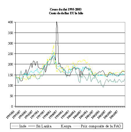 1 Par définition, l'indice du prix composite du thé de la FAO n'est pas un prix: il s'agit plutôt d'un indicateur de la tendance générale du marché du thé, englobant tous les principaux prix d'adjudication. Cet indice n'est donc pas une variable que les agents pourraient prendre en compte pour décider d'une transaction en particulier, mais un élément servant de référence pour orienter l'ensemble de leurs décisions.