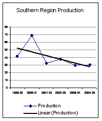 The figures show fluctuations in the total area planted over the past five years. Between 2000/01 and 2003/04 actively cultivated area varied from 230 000 ha to 196 800 ha.