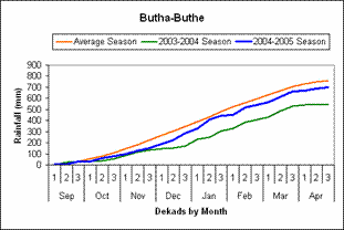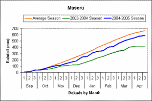 Rainfall estimates for 2004/05 are shown in Figure 2, derived from satellite data by SADC Remote Sensing Programme. The graphs show that in the central region (Berea, Butha-Buthe, Leribe and Maseru) cumulative rainfall was above last year but below average. It also started somewhat late leading to late planting in many areas. In the southern region (Mafeteng, Mohale’s Hoek, Qacha’s Nek and Quthing) rainfall was above average in Qacha’s Nek, close to average in Mohale’s Hoek and Quthing and below average but above last year in Mafeteng. In the mountain region (Mokhotlong, Thaba-Tseka), rainfall was normal throughout the season. These data are consistent with those of Lesotho Meteorological Services. Thus, overall, Lesotho’s rainfall situation in 2004/05 was generally favourable for crop production, although less than satisfactory in the central region, the country’s breadbasket. Moreover, there were no major incidences of early frost and dry spells.
