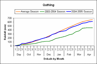 Area planted to cereals in 2004/05 is estimated at 208 200 ha, slightly higher than the 2003/04 official post harvest figure of 196 800 ha which was released by the government after last year’s CFSAM report was published. This area figure is also slightly higher than the five-year average by about 6 percent. Although this season was better than last year, a combination of factors depressed the yields. These included late onset of rains and reduction in the use of improved seed and chemical fertilizers following the withdrawal of subsidies on farm inputs.
