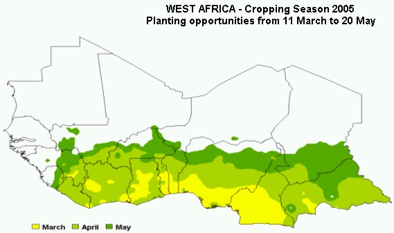 The cropping season has started in the south amid concerns for food security in parts of the country. Land preparation is underway and first planting has started in the extreme south, following first rains in May. Planting will progress northwards with rains. Availability of seeds may be a problem in the regions hard hit last year by desert locust invasion and poor rainfall. No swarm of desert locust has been reported so far. However, low numbers of adults are likely to be present and breeding in parts of the Adrar des Iforas, the Tilemsi Valley and in the timetrine. Intensive surveys should immediately commence in these areas.