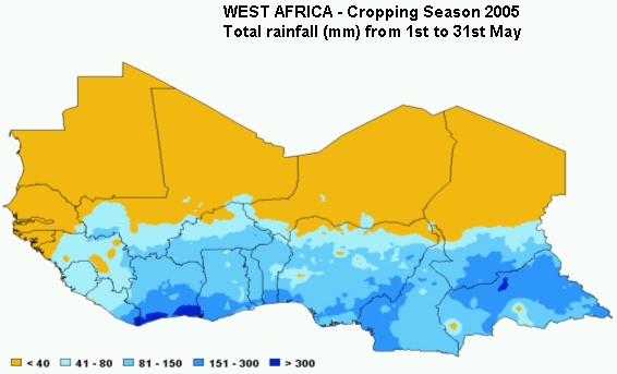 The rainy season has started normally in the Sahel. Seasonal rains commenced in late April or May in southern Burkina Faso, Chad, Mali, Niger and the extreme south-east of Senegal. Seasonably dry conditions prevail in the rest of Senegal, Cape Verde, The Gambia , Mauritania and most of Guinea-Bissau .