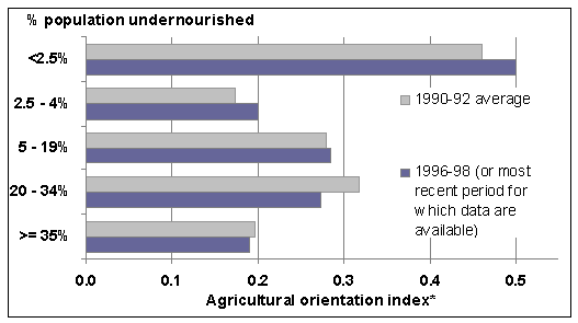 38. Des niveaux élevés de sous-alimentation et une forte dépendance vis-à-vis des exportations agricoles vont souvent de pair. Les groupes de pays où la sous-alimentation est la plus forte tendent à dépendre de leur production agricole pour une grande partie de leurs revenus nationaux, de leurs emplois et de leurs recettes d'exportation (Annexe, figure 15). En même temps, le groupe de pays où la sous-alimentation est la plus répandue dépense plus de 14 pour cent de ses recettes totales d'exportation pour financer des importations alimentaires (Annexe, figure 16). Qui plus est, les pays où la sous-alimentation est la plus grave sont aussi ceux dont le secteur agricole est le moins bien intégré aux marchés internationaux (Annexe, figure 17).