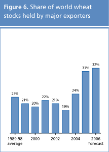 The forecast for wheat stocks for crop years ending in 2006 has been revised upwards by 4 million tonnes to 163 million tonnes since the previous report. At this level, global wheat stocks would be about 10 million tonnes, or 5 percent, smaller than their opening level. Most of this month's revisions reflect upward adjustments to the estimates for this year’s wheat production in several countries, including a number of wheat exporting countries. The anticipated decline in world reserves this season is mostly driven by further reductions in inventories in China as well as in India, Turkey, the Syrian Arab Republic, and Morocco. Ending stocks in the EU are also forecast to decline from their exceptionally high levels as a result of a sharp fall in this year’s production. In the United States, wheat inventories are forecast to increase as exports may decline because of increased competition. For the major exporters, as a group, total wheat stocks are now forecast to approach 52 million tonnes, up 2 million tonnes from the previous report and now only slightly below their opening levels. At the current forecast level, aggregate wheat stocks held by major exporters represent 32 percent of the world total, similar to the estimated ratio in 2004/05 and still highest in 2 decades. Moreover, total wheat stocks held by major exporters as a percentage of their total disappearance (defined as domestic utilization and exports) remains fairly steady at around 21 percent, lower than in the previous season but close to its 10-year trend.