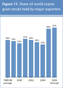 The forecast for world coarse grains stocks for crop years ending in 2006 has been lowered by as much as 17 million tonnes since the previous report, to 172 million tonnes. The adjustment is mainly driven by a sharp cut in the forecast for world production in 2005. At the current forecast level, world ending stocks of coarse grains are expected to decline by roughly 20 million tonnes, or 11 percent, from their relatively large carry-in levels. Contrary to earlier expectations, total coarse grains inventories in major exporters could decline sharply, mostly in the EU as a result of a significant drop in production. Based on the latest estimates, stocks held by major exporters by the end of the seasons in 2006 could reach 80 million tonnes, down 12 million tonnes since the previous report and also 10 million tonnes below their high opening levels. As a result, the overall global share of coarse grains inventories held by the major exports are now expected to remain close to the previous season’s level. Elsewhere, significant decreases in stocks could be expected also in China and Brazil where production declines are expected to drive down maize inventories. Similarly, as a result of this year’s less favourable production prospects, smaller barley inventories are expected in most countries in North Africa, Morocco in particular.