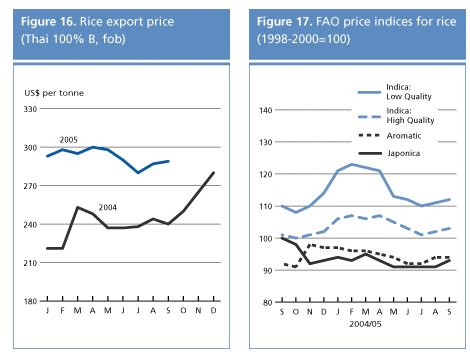 International rice prices weakened somewhat in June and July, as reflected in the FAO All Rice Price Index (1998-2000=100), which lost 1 point in each of the two months, dropping to 100 in July, the lowest index value since February 2004. In August and September, prices regained some strength with the Index rising to 101 and 102 respectively, reflecting higher quotations especially of Indica (both of the lower and higher quality) and Aromatic rice. By contrast, the sub-index for Japonica rice stayed at 93 between July and September. The weakness of international prices in June and July mainly reflected sluggish import demand and relatively large supplies following the harvests of secondary 2004 crops in some major exporting countries. Renewed competition from India and China also tended to depress prices. In August, however, the announcement of higher procurement prices in Thailand and the resumption of shipments to Africa and Iraq imparted new strength to the market. International prices have continued to firm in the first weeks of September, reflecting the return of Indonesia on the import market, strong sales to Africa and new contract for deliveries to Iraq. Thailand’s sale, in September, of 900 000 tonnes of government-owned rice through tenders was made at relatively high prices and did not depress the market. The price strength is expected to continue in the coming months, partly in reaction to rising production and marketing costs, which have been associated with the surge in oil prices. Prices are also expected to react strongly to new developments regarding crops and government policies.